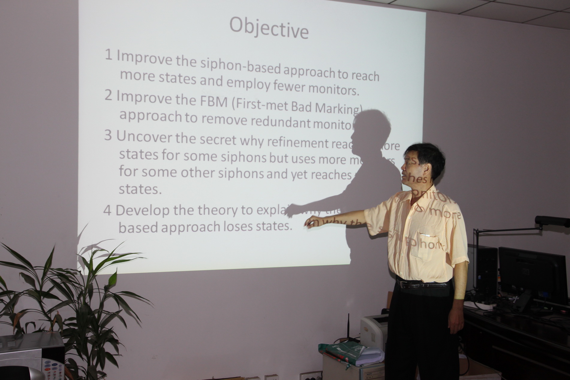 而首遇坏标识方法(FBM: first-met bad marking method) 通过采用局部区域法改进一些控制器从而可以得到更多的可达状态,但是却要添加较多的控制器。赵玉教授的报告向与会教师和博士生介绍了改进了基于信标的死锁控制和首遇坏标识方法,使得基于信标的方法在添加较少控制器时能得到更多的可达状态。对于FBM的方法则减少了所添加的控制器,减小了控制系统的结构复杂性。赵玉教授还向与会师生介绍了Petri网的历史与发展,以及现今Petri网研究的前沿方向。
