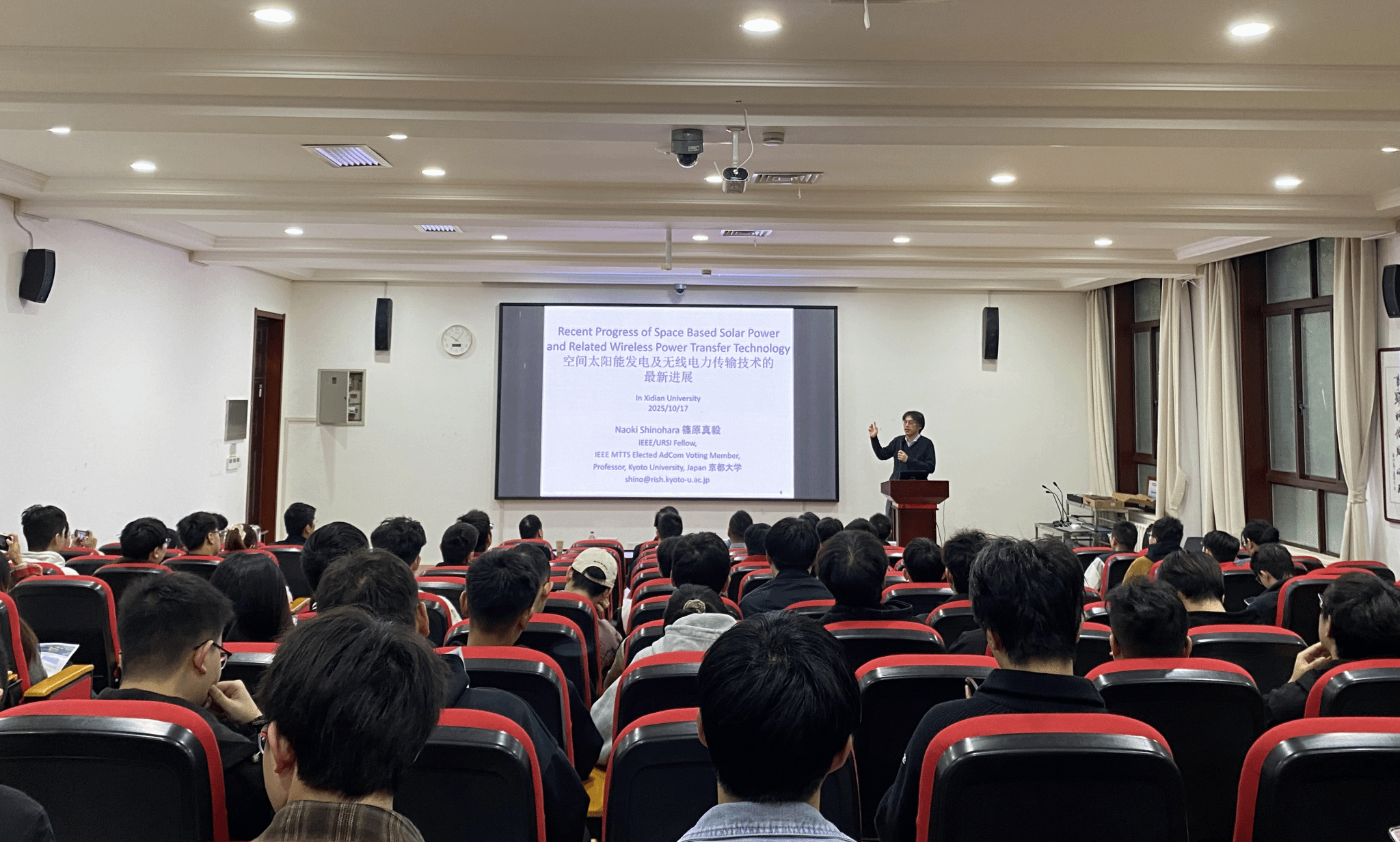 Shinohara教授回顾了空间太阳能电站从上世纪70年代的科幻构想到如今多国竞相布局现实工程的发展历程。他指出:“SSPS通过地球同步轨道上的太阳能卫星收集能量,以微波形式无线传输至地面,可实现24小时稳定供电,是应对全球变暖与能源危机的重要技术路径。”他提到,京都大学团队已在实验室内实现千瓦级微波能量传输,并正推进高空平台与小型卫星验证项目。Shinohara教授通过清晰的图示、翔实的数据和生动的案例,深入浅出地阐释了微波传能中的关键技术瓶颈,如高功率发射天线设计、大气衰减补偿及接收整流效率提升等。他认为:“SSPS不仅是能源方案,更是连接学术、产业与国际合作的桥梁。”